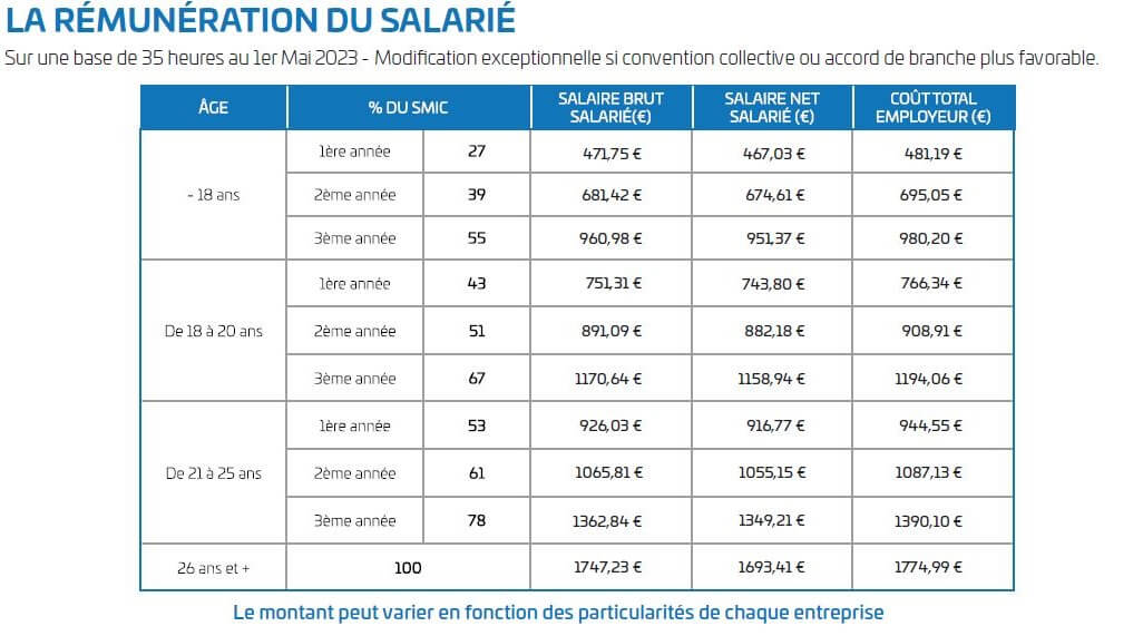 Le titulaire d’un contrat d’apprentissage est un salarié à part entière. Le temps de formation est inclus dans le temps de travail et les coûts de formation sont pris en charge par l’OPCO de l’entreprise. 5 jours de congés sont mis à disposition des élèves dans le cadre des révisions de leurs examens. Le salaire versé par l’employeur est défini sur la base légale de rémunération.